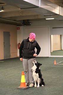 Sunnuntaina koulutus jatkui heti aamusta ja vuorossa kolmen liikkeen kisamainen treeni jossa myös tärkeässä osassa kehään meno ja poistuminen sieltä! Uunolle valitsin hyppynoudon koska vieras paikka ja kapula ja niissä ongelmaa, ruutu koska kiva liike ja seuruu kun halusin kuulla Oilin kommentit siitä!